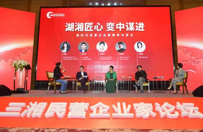 论坛上,三一集团董事、三湘银行董事长梁在中,中国民营经济研究中心主任、北师大教授韩晶,湖南省女企业家商会会长、岳麓山建筑集团董事长吴建平,中国商业文化研究会湘商文化分会会长伍继延,湖南湾田集团总裁刘筱泉五人围绕“湖湘匠心 变中谋进——新时代民营企业家精神与责任”主题进行了专题讨论交流,共同碰撞思想火花。