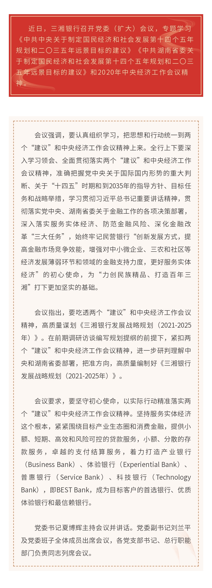 三湘银行召开党委(扩大)会议,专题学习两个“建议”及2020年中央经济工作会议精神
