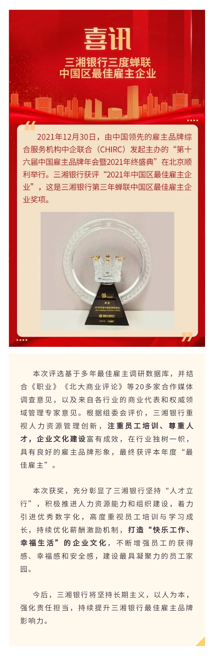 喜讯!三湘银行三度蝉联中国区最佳雇主企业